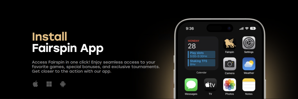 Kaasaegne mängija ei ole aheldatud lauaarvuti taha. Tänapäeval toimub üle 70% mängudest nutiseadmete kaudu ning Fairspin on selleks ideaalselt valmistunud. Selle asemel, et koormata mängijaid aeglaste ja tihti piirangutega rakendustepoodide äppidega, oleme arendanud tipptasemel Fairspin app lahenduse, mis kasutab PWA (Progressive Web App) tehnoloogiat.