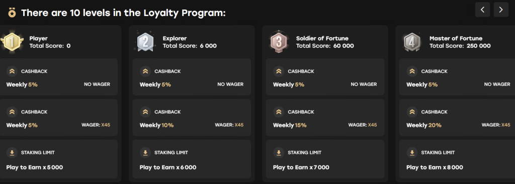 Fairspin on astunud sammu edasi ja hüljanud vananenud, sageli läbipaistmatud lojaalsussüsteemid, mida paljud konkurendid siiani kasutavad. Meie oleme selle asendanud dünaamilise ja ausa 10-astmelise lojaalsusredeliga, mis põhineb otseselt teie mänguaktiivsusel ja panustatud summadel. Iga kord, kui keerutate rullikuid või teete panuse spordile, teenite punkte, mis kergitavad teid VIP-edetabelis kõrgemale.